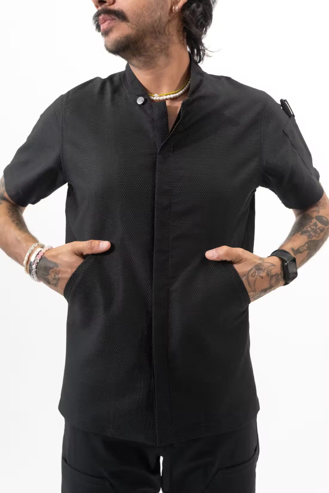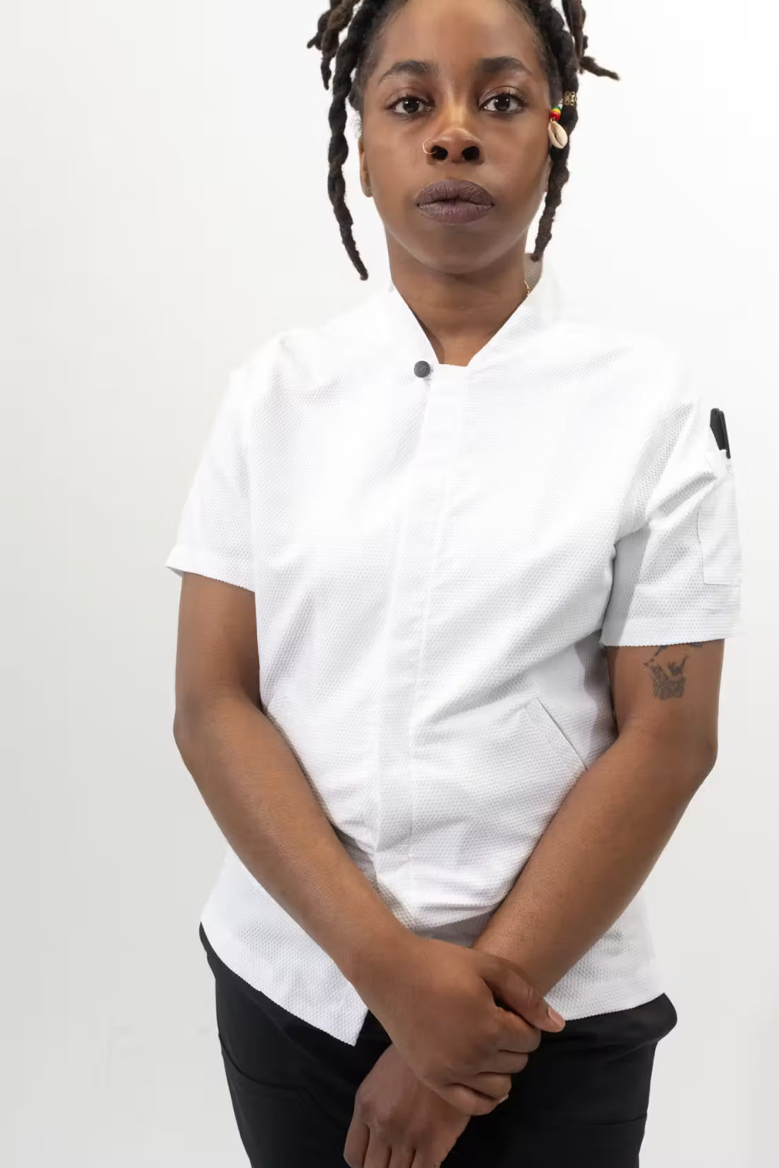 Offered in Black and White, this chef coat is a blend of chef shirt, with the mock neck closer and our beloved contra, with slanted welter hip pockets. Some consider it the best of both worlds, we just call it, efficiency.