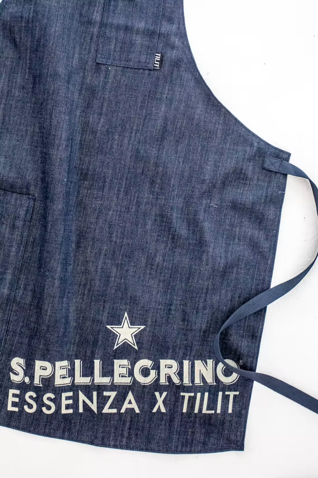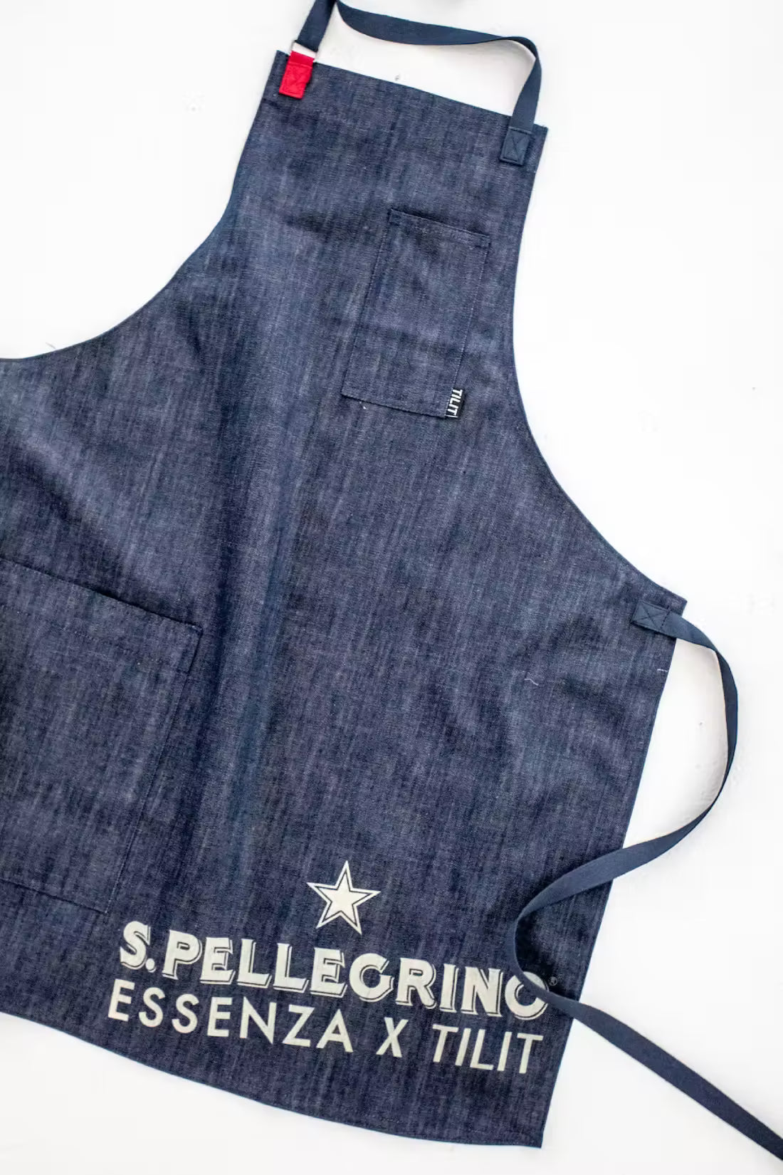 The apron is designed from 100% Cardini Denim crafted in Italy. A functional and stylish apron developed with a chest pocket and hip pocket as well as adjustable cotton neck and waist ties and laser marked with both the San Pellegrino and TILIT logo.