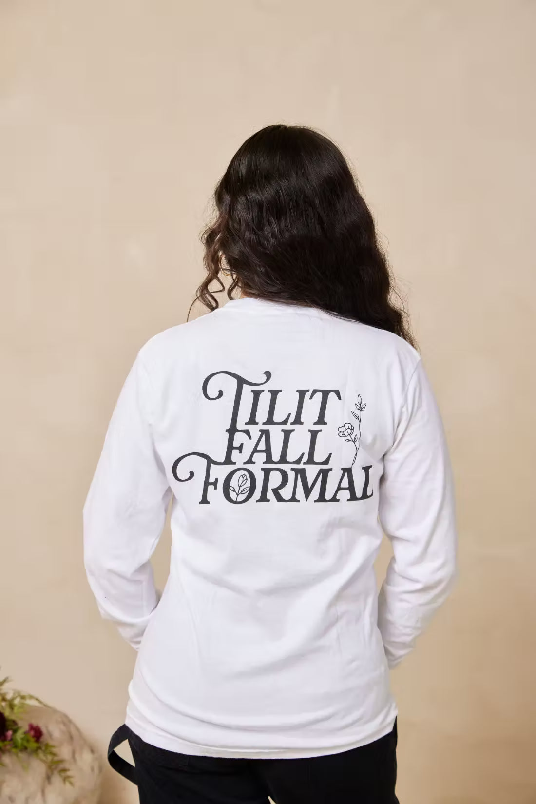 The Fall Formal Long Sleeve Tee returns in classic white, crafted from 100% premium cotton for unmatched comfort. Featuring eye-catching back art, this tee showcases the iconic TILIT logo surrounded by floral art deco.