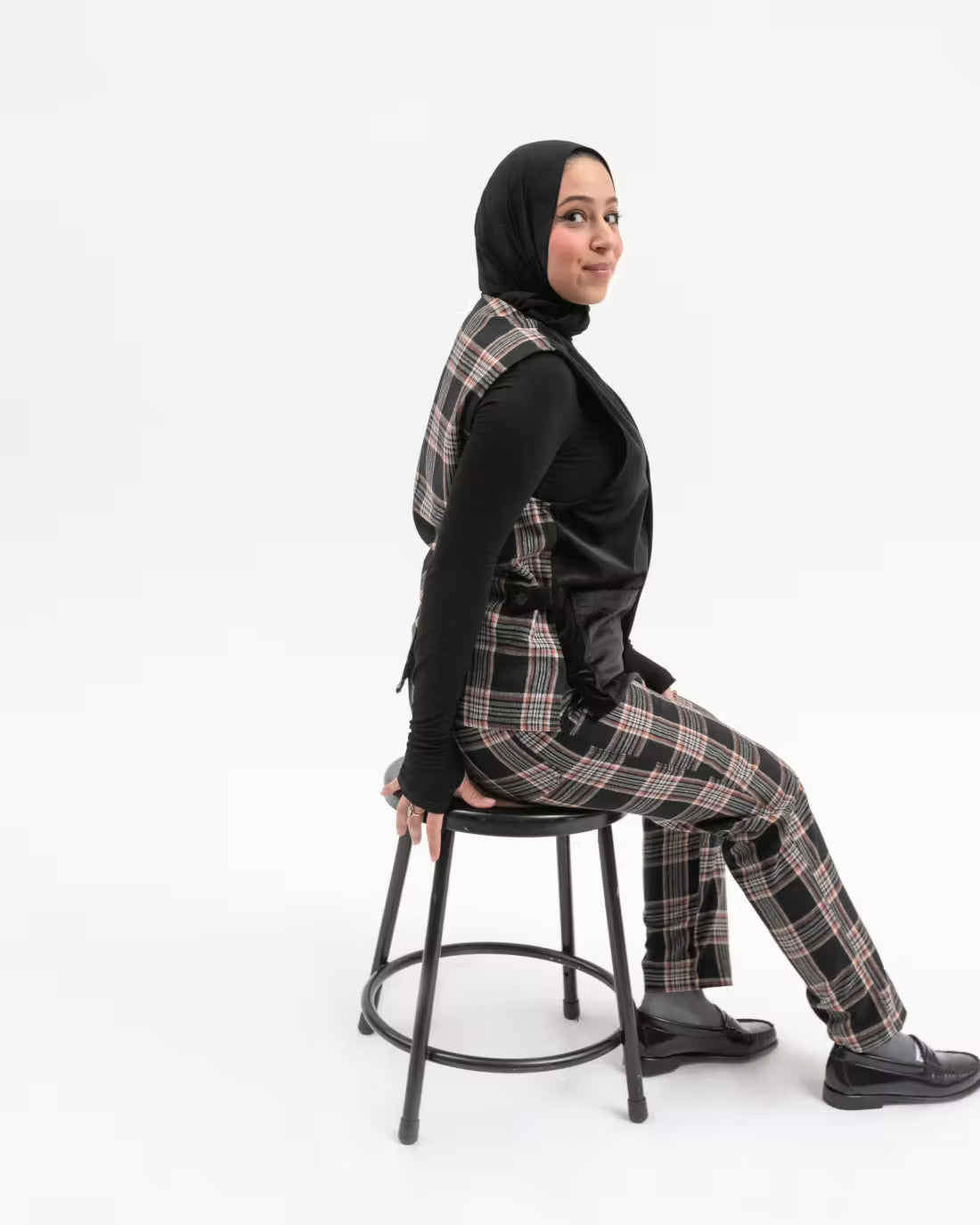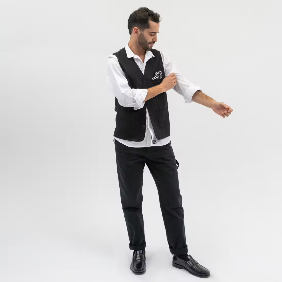 Elevate your workwear with this expertly tailored Fall Formal Utility Vest. Offered in black herringbone denim with a glossy twill and black velvet with a bold black wool plaid back panel. Designed for the hospitality professional on the go, it features: