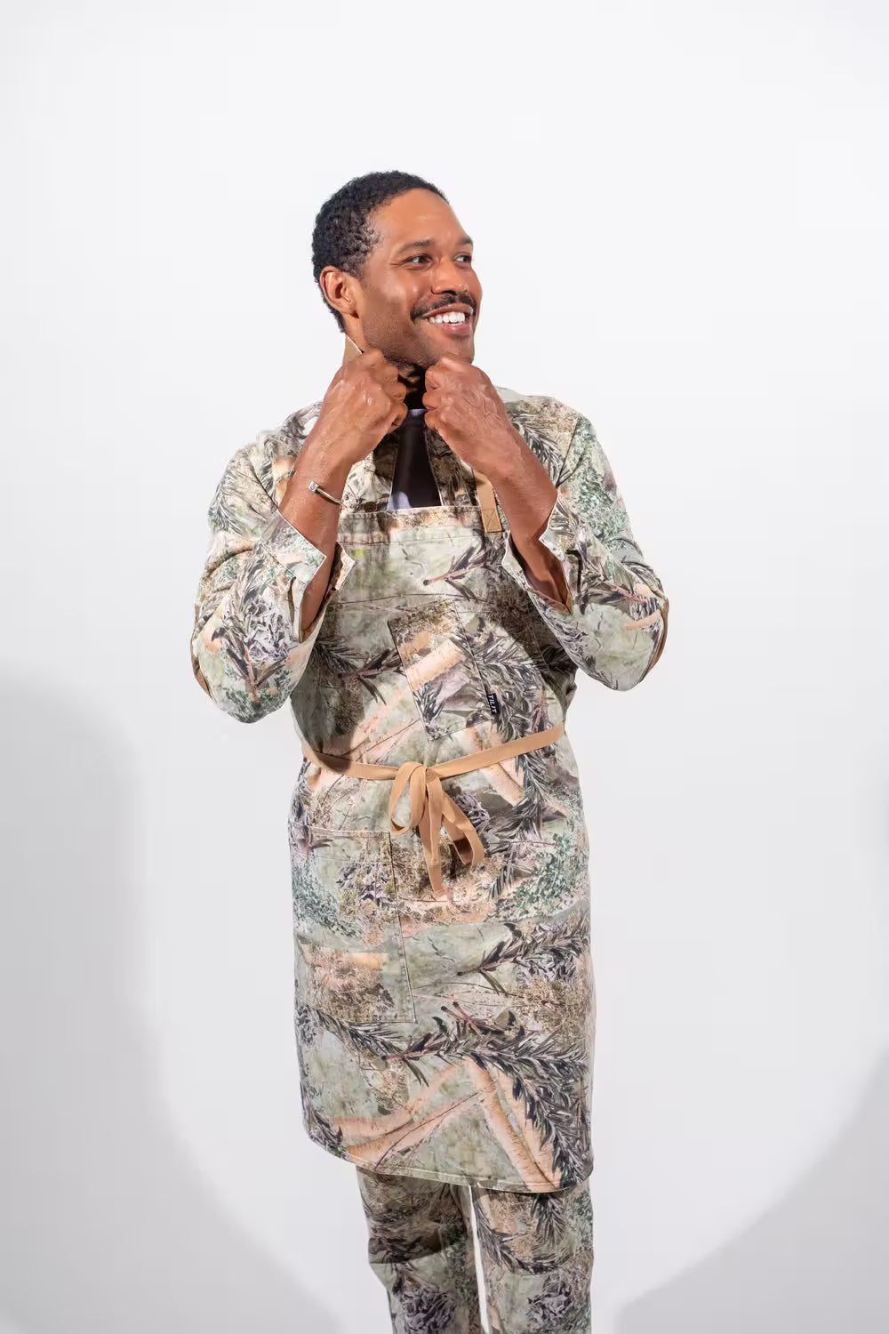 Crafted for chefs who move with the rhythm of the season, the Harvest Brooklyn Camo Apron blends functionality with a one-of-a-kind design inspired by the ingredients of fall. Made from 100% cotton Vienna Herringbone and stonewashed for a broken-in feel, it’s built to move with you through every service. The custom Herb Camo print, designed by Alex, features an intricate blend of kitchen staples like sage, bay, and rosemary, reimagined into a pattern that makes chefs stand out rather than blend in.