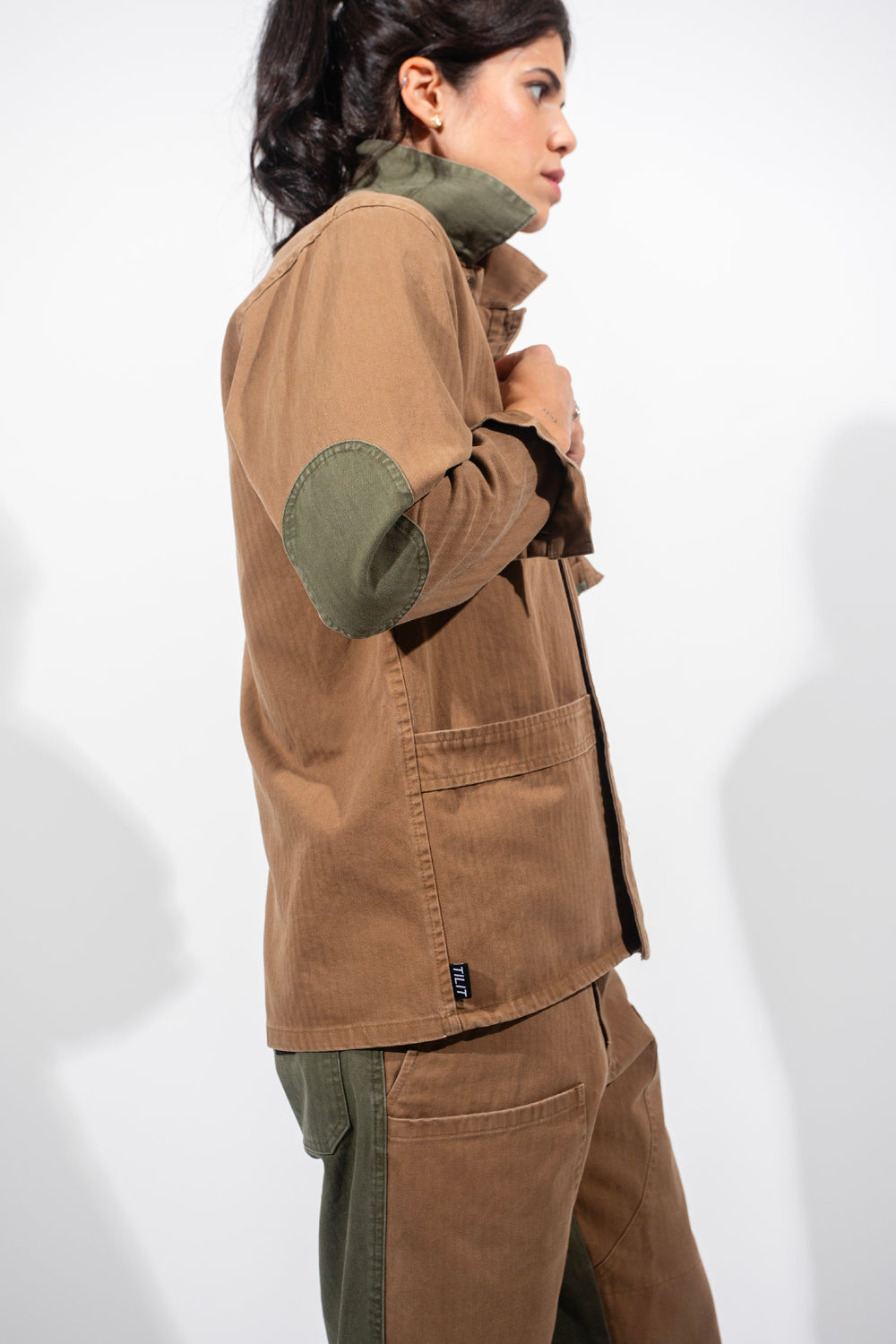 Offered in two styles: Herb Camo, custom-designed by Alex, with tan accents at the neck yoke, undercollar, elbow pads, and cuffs; and Tan, featuring army green detailing in the same areas. Both are crafted from 100% cotton Vienna herringbone, stonewashed for a comfortable, lived-in feel, and finished with durable brass metal buttons.