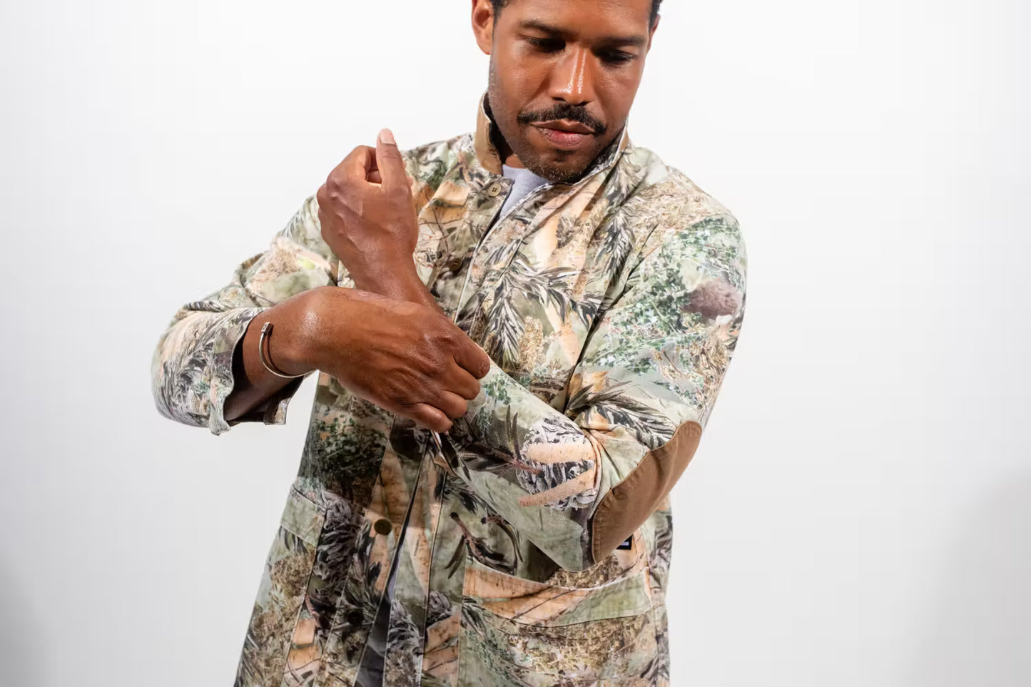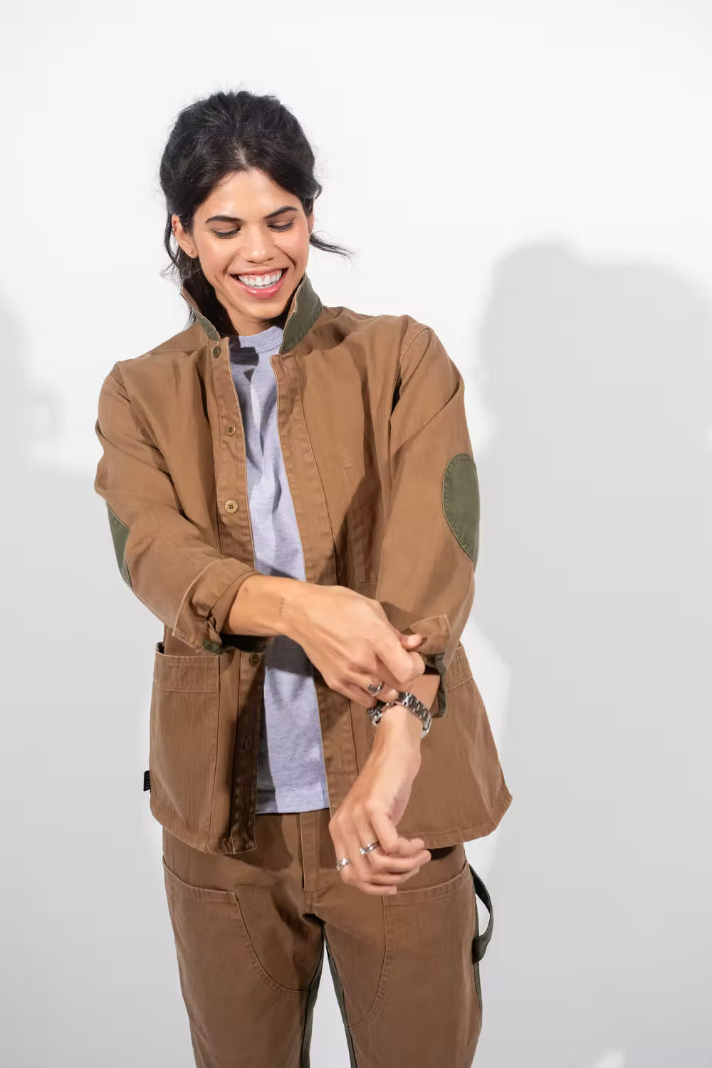 Offered in two styles: Herb Camo, custom-designed by Alex, with tan accents at the neck yoke, undercollar, elbow pads, and cuffs; and Tan, featuring army green detailing in the same areas. Both are crafted from 100% cotton Vienna herringbone, stonewashed for a comfortable, lived-in feel, and finished with durable brass metal buttons.