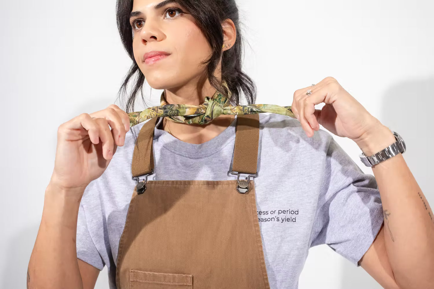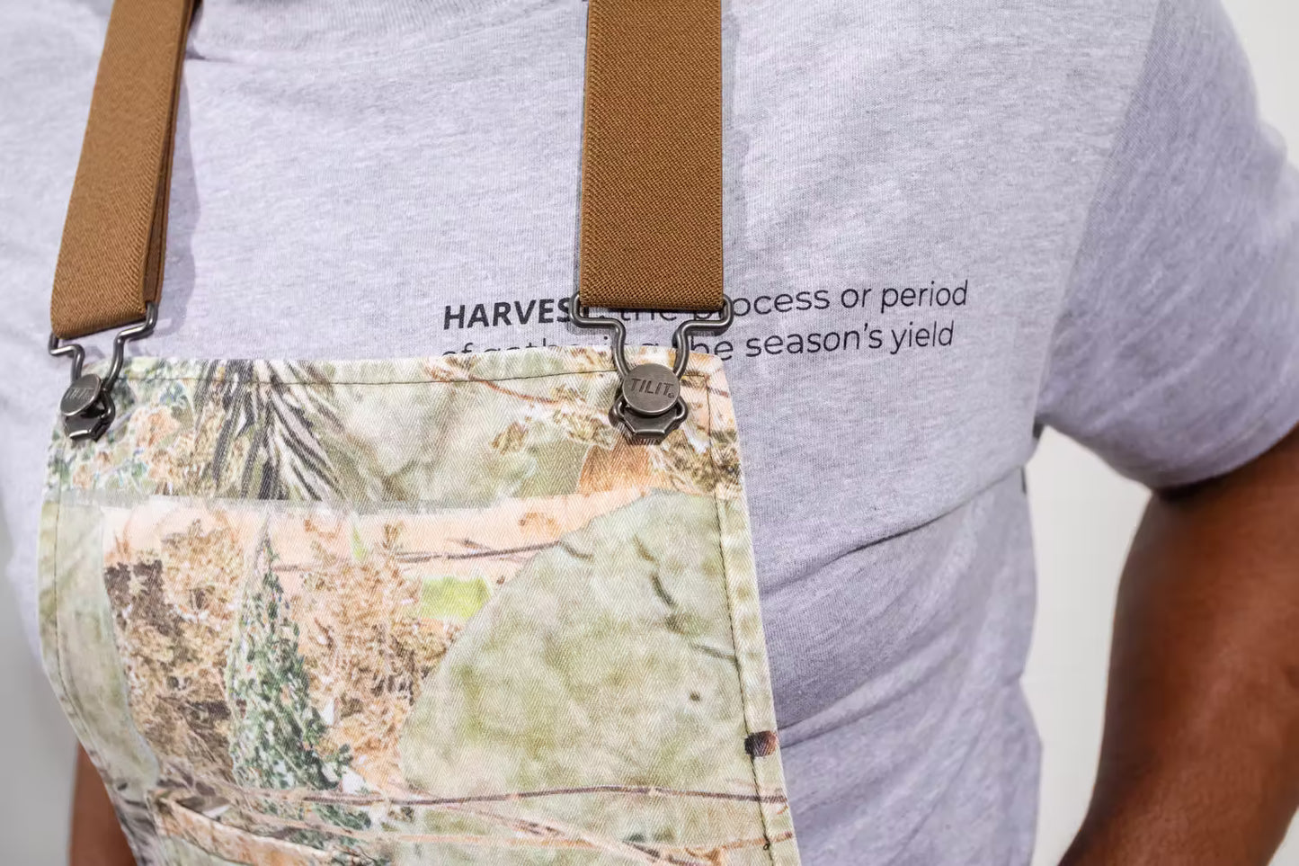 Inspired by the shift of the season, the Harvest Overalls merge classic utility with the colors and textures of fall. Designed in 100% Herringbone cotton and stonewashed for a lived-in feel, these overalls are built for durability and comfort in and out of the kitchen. Available in two colorways, our custom Herb Camo print designed by TILIT's CCO and resident Chef, Alex, and a tan style featuring army green accents across the back legs, pockets, and towel loop. Each pair pays homage to the changing harvest and the balance between work and creativity. Product Details
