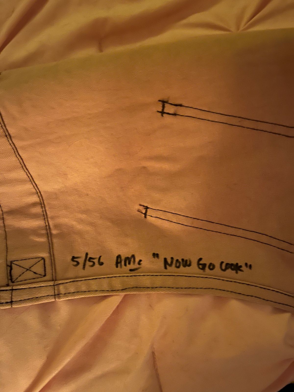 Please wash in cold water. Ink, especially on the natural/cream apron, may fade or bleed over time, given the custom, hand-dipped nature.