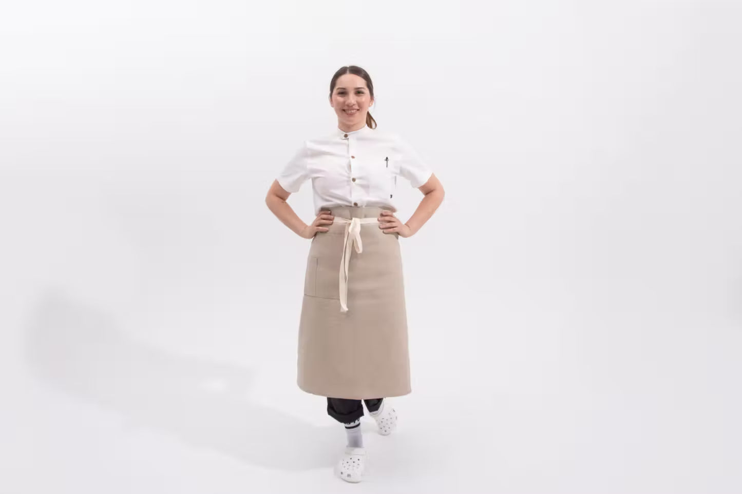 Our classic chef work wear that are showstoppers in the kitchen as well as comfortable and functional has now joined together. Experience the innovative comfort and functionality of our "French Kitchen Workshirt" with a flap button pocket, hidden sharpie slot and traditional collar, plus our "Chef Shirt" featuring a breast pocket for a thermometer/pen, a phone/notepad slot and extended back, armpit vents and apron strap tab--ideal for kitchen activities.
