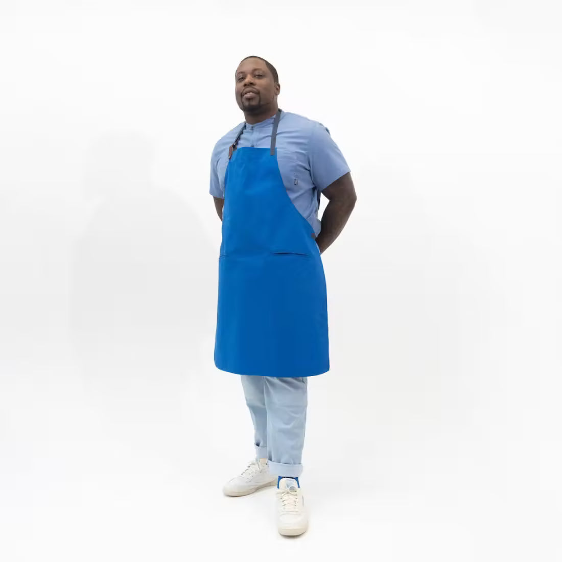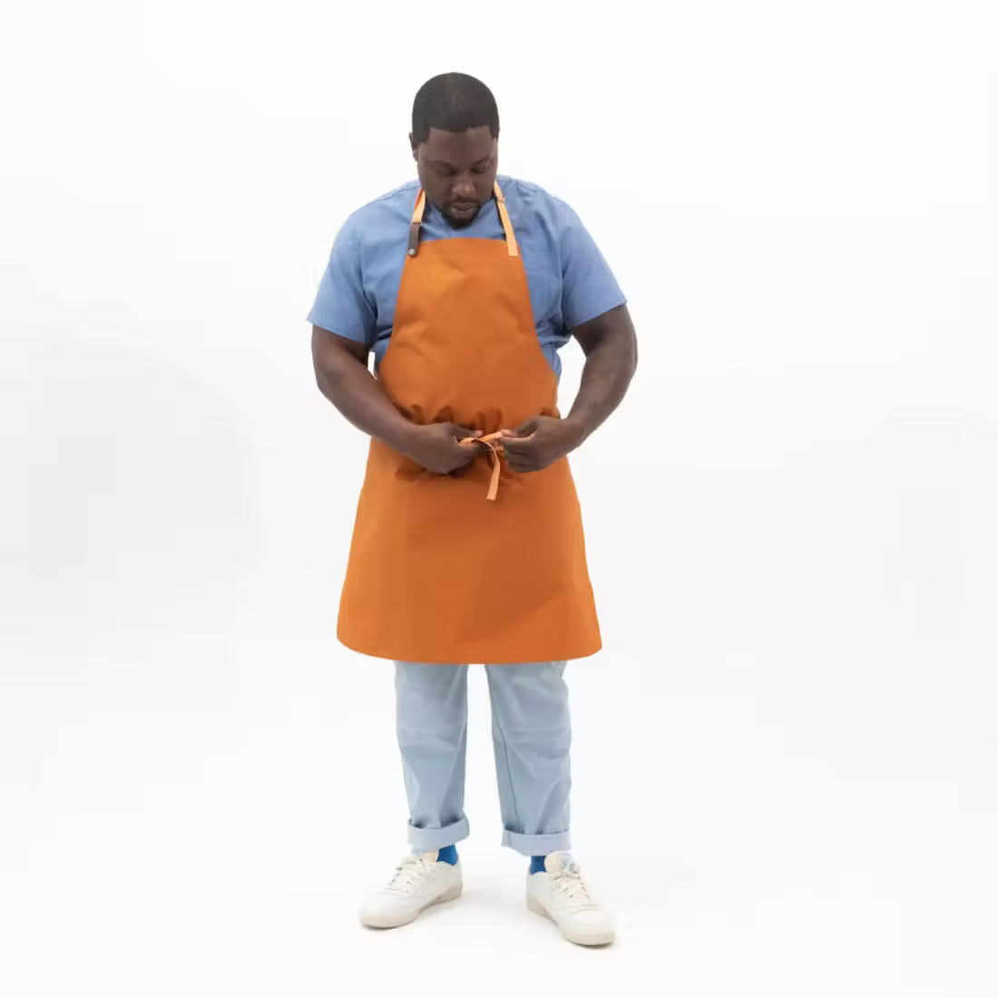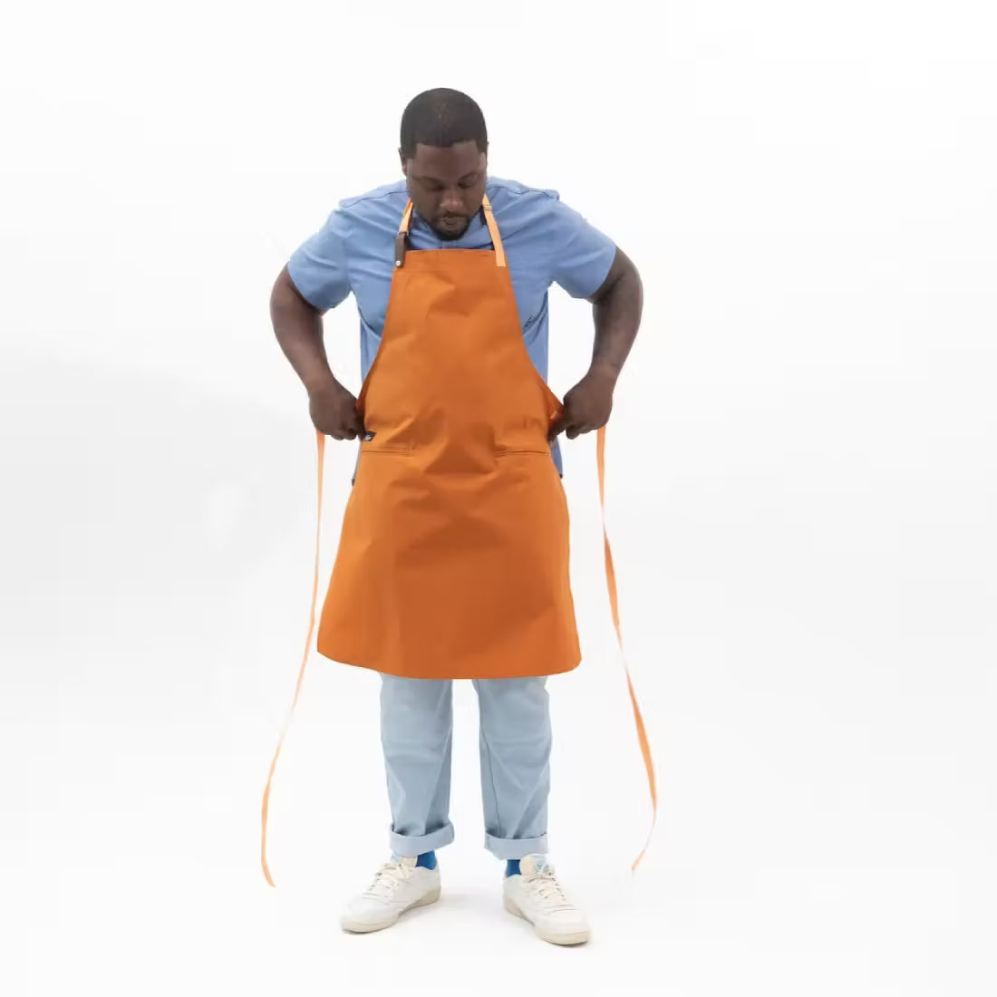 Introducing our popular apron, now available in the exclusive Over Easy collection. The beloved Contra design includes leather accents, two secure hip pockets, and an adjustable cotton neck strap. Perfect for its durable, washable cotton, spill-resistant qualities, and easy machine care. USA-made and 100% cotton, in Apricot and French Blue. A definite win-win situation.