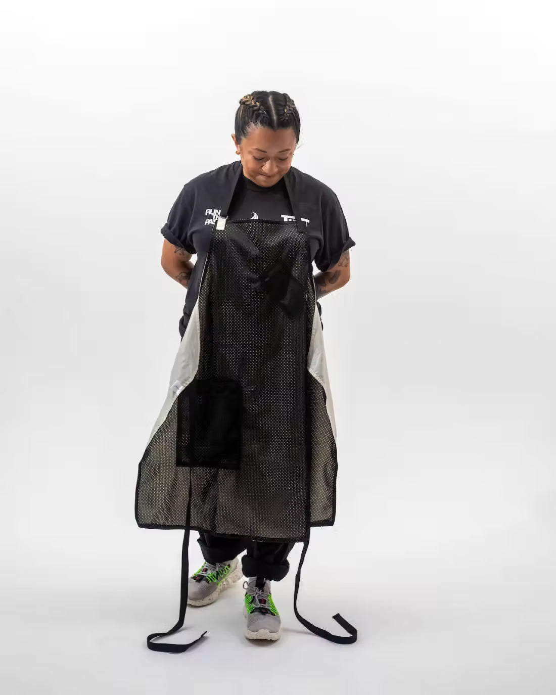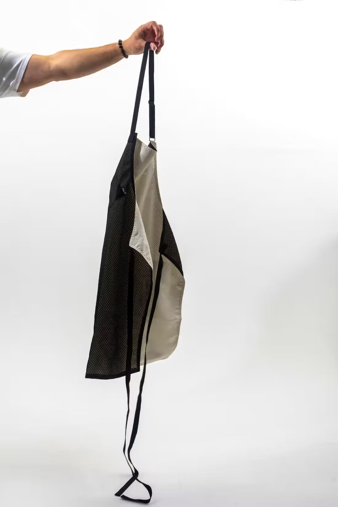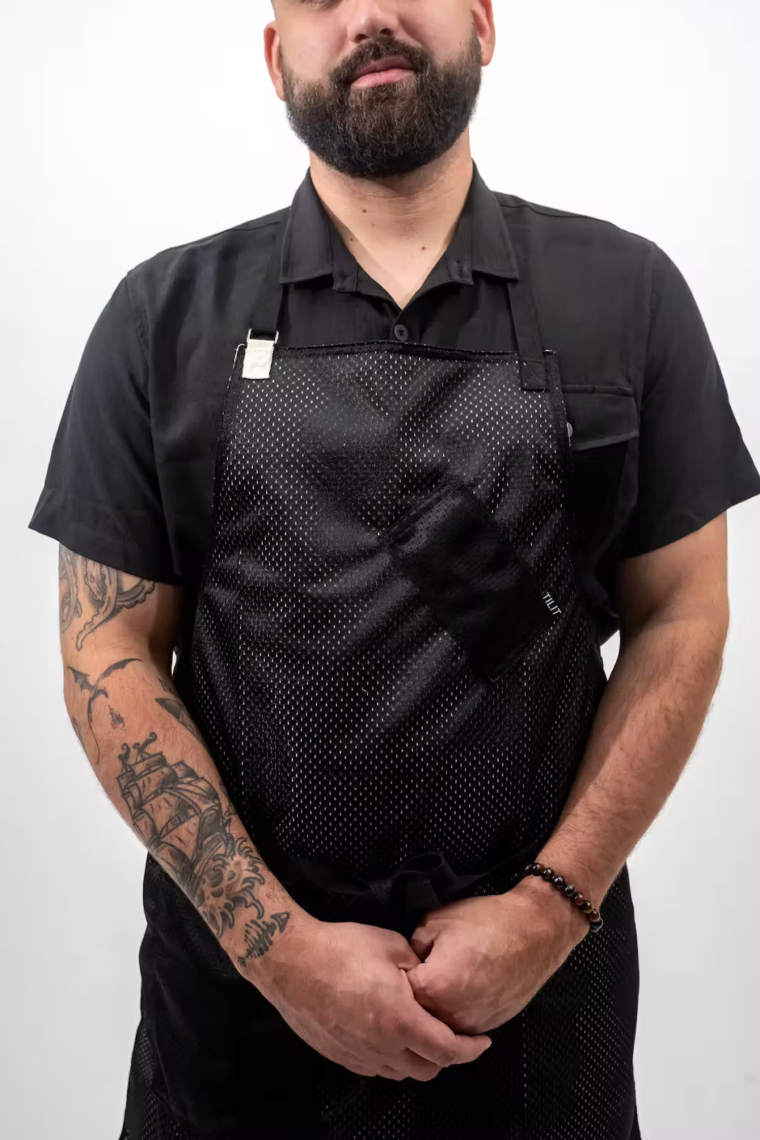 The Run the Pass Mesh Apron is a fresh take on traditional kitchen gear, made for chefs embracing a new pace inside and outside the kitchen. Designed with a black mesh body, this apron keeps you cool during high-heat service, while an ivory pilot twill lining provides essential durability and structure. The subtle contrast adds depth without distracting from the work. For chefs running the pass, or the miles - this apron is built to keep up.