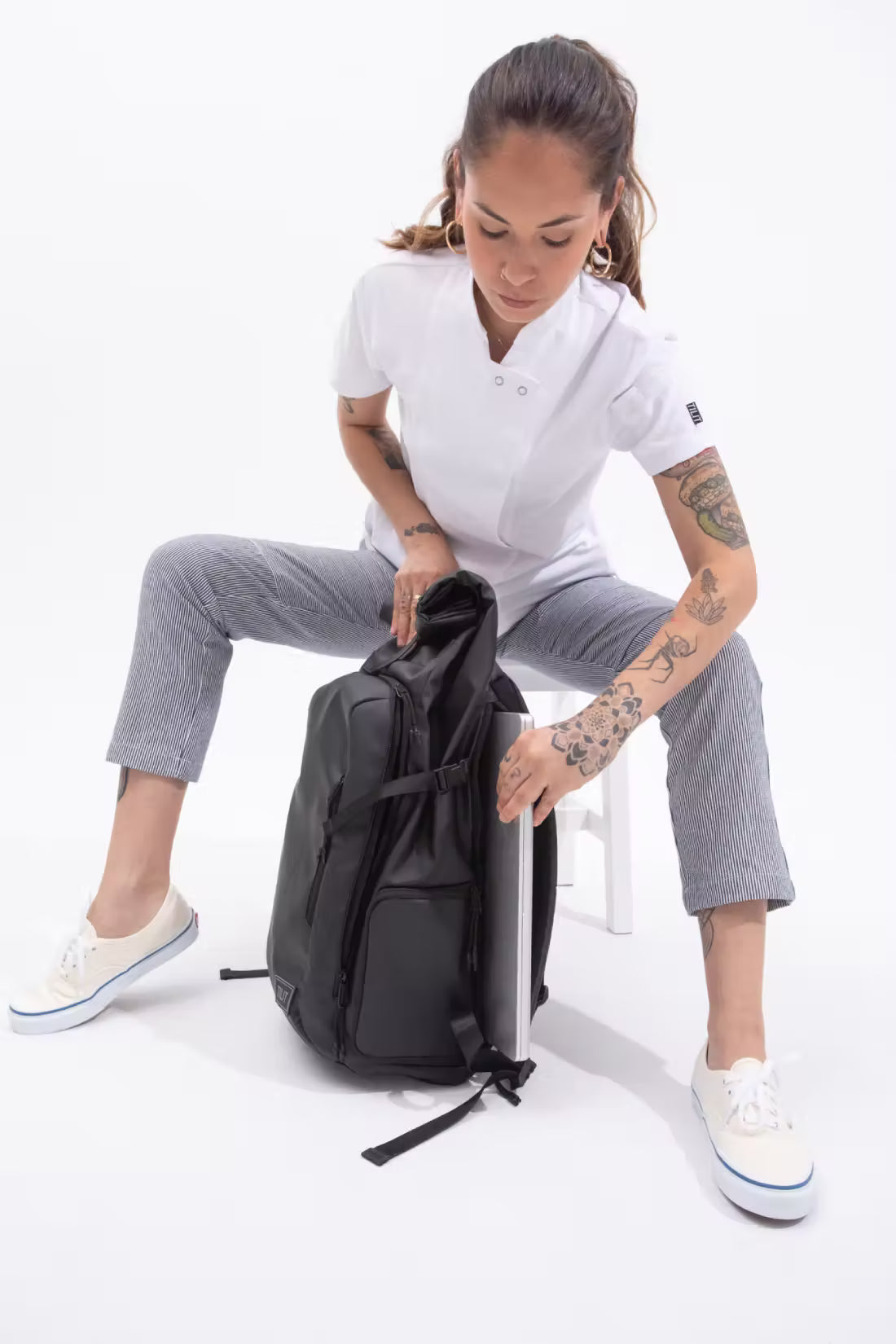 The Chef Backpack was created through a series of designs with input from cooks and chefs all over the country. Tilit’s modern culinary backpack was developed to carry chef clothes, laptop computers, chef tools, and chef knives safely to and from work without the need for a second tool bag. This new design has added a roll top: allowing for hefty packing of market finds, a rubberized shoe compartment (fits up to a M10.5), an expandable exterior water bottle pocket, and an all-over exterior coated in rubber to repel against odors and moisture.