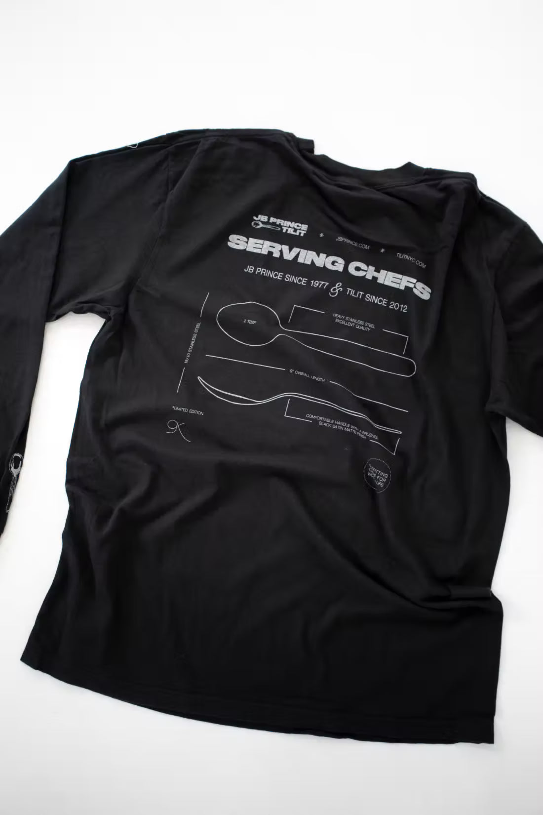 Show off your love for culinary innovation with the Black Long Sleeve TILIT X JB Prince Spoon Shirt. Inspired by TILIT x JB Prince matte black Kunz Spoon, this shirt blends style with a touch of playful sophistication.