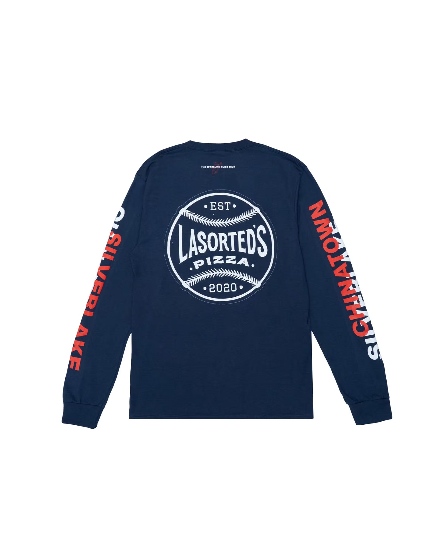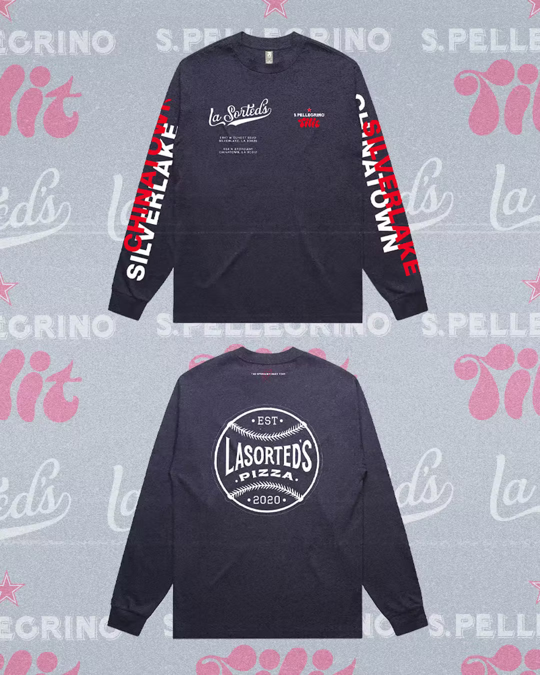 Born from a backyard oven, La Sorted’s is now a Silverlake staple. We teamed up with them and S.Pellegrino to create this limited-edition long sleeve tee, printed on soft cotton in classic navy. Featuring bold LA-inspired graphics and a baseball motif, it’s a nod to the love of baseball and the pizza-loving community. Whether you’re posted up in Silverlake or catching a show downtown, LA keeps you moving.