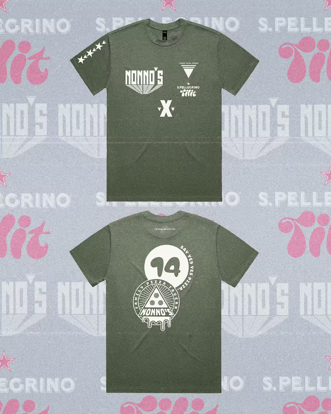Step into a slice of nostalgia with the TILIT x S.Pellegrino x Nonno’s Pizza Short Sleeve Tee. Crafted from a soft, breathable cotton in olive green, this tee captures the playful spirit of Nonno’s Family Pizza Tavern in Houston’s Montrose neighborhood. Whether you’re exploring Montrose or soaking up the Houston energy, you move fast and live bold. With a tavern-style pie from Nonno’s and a crisp S.Pellegrino in hand, nothing can stop you in this limited-edition tee.