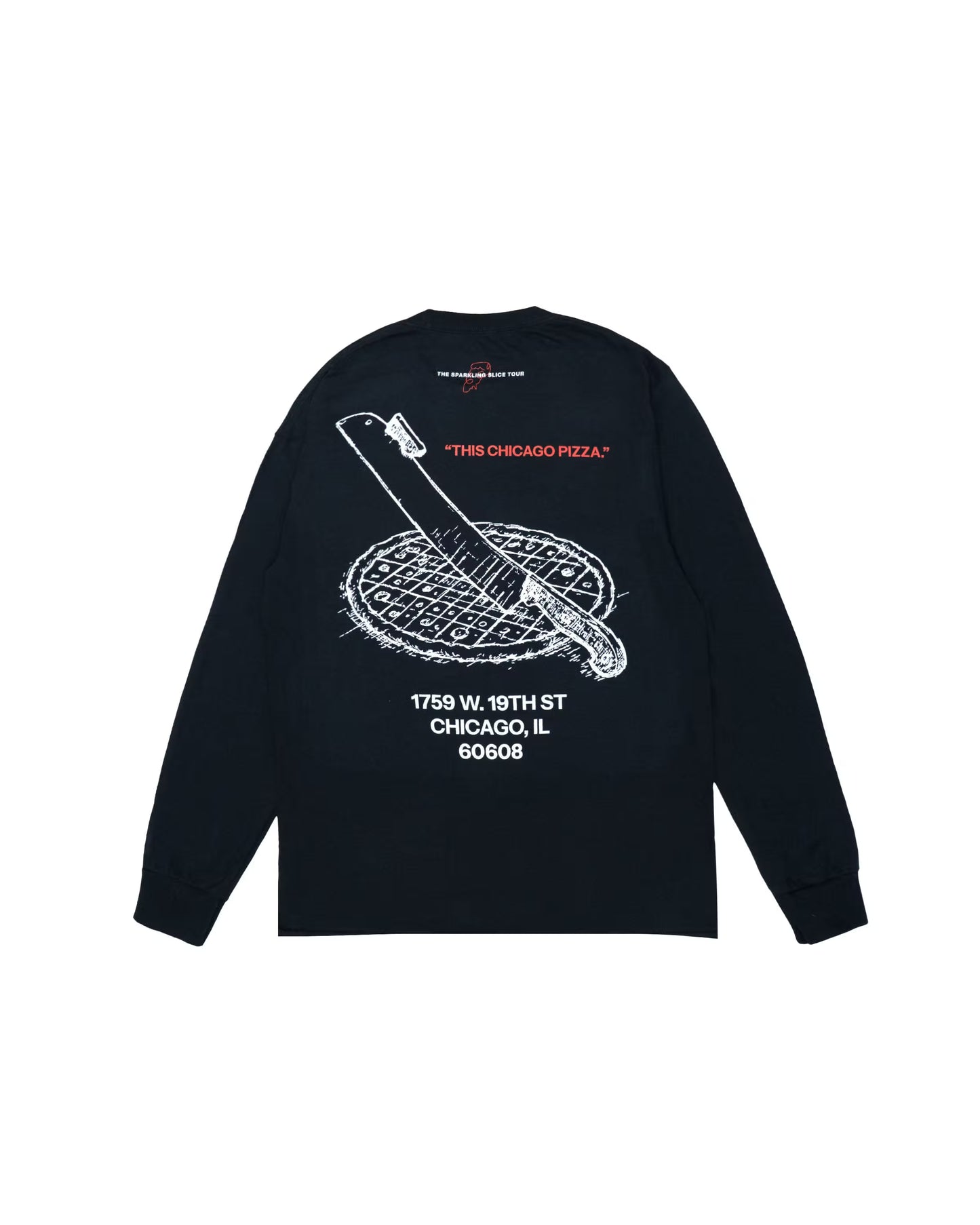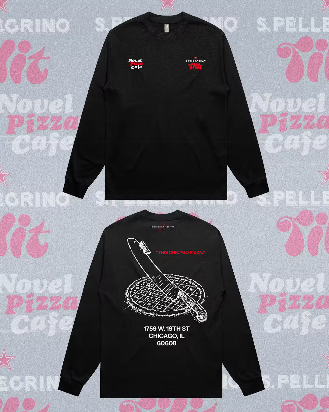Celebrate culinary innovation and community with the TILIT x S.Pellegrino® x Novel Pizza Long Sleeve Tee. Made from a soft, breathable cotton in sleek black, this tee blends comfort with street-ready style. Whether you’re exploring Pilsen, grabbing a slice in Wicker Park, or soaking up Chicago’s neighborhood energy, you move fast and live bold. With a tavern-style pie from Novel Pizza and a crisp S.Pellegrino in hand, nothing can stop you in this limited-edition tee.