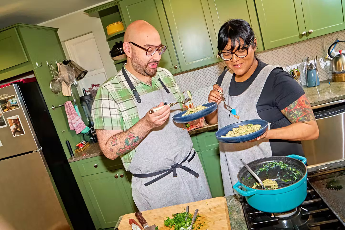 Inspired by Ham, an excellent partner in the kitchen since meeting Sohla in culinary school, The Ham Apron is a complement and meaningful part of the Sohla El-Waylly x TILIT collection. The Tilit fave, Satterfield Apron, inspires this seafoam gray bib apron but uniquely has a black leather neck snap and black adjustable neck straps and waist straps. Thoughtful deals like the check pen pocket and navy highlighted welt hip pocket openings marry style and utility. The Ham apron is made from 100% cotton designed with love in NYC and made in the USA.