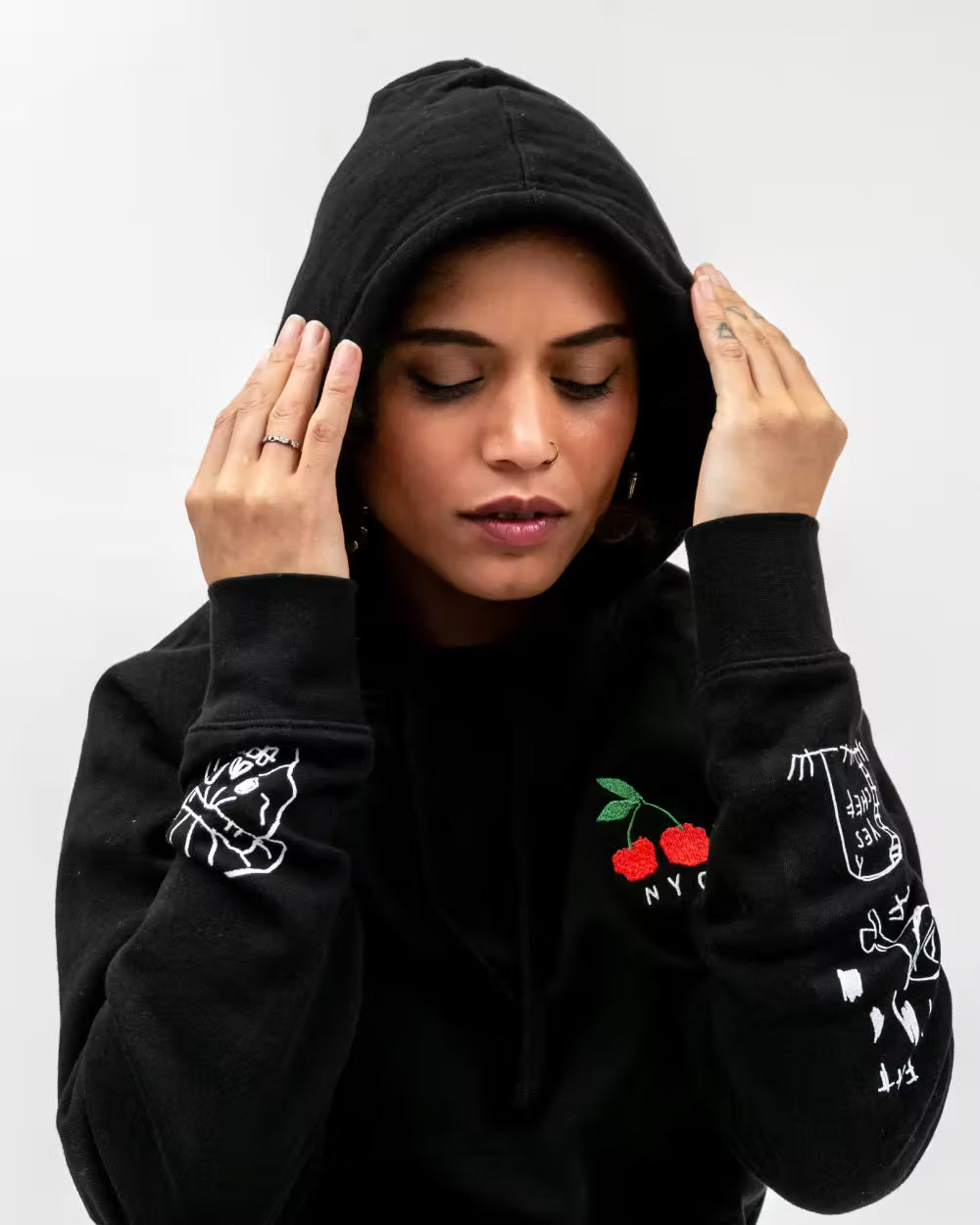The “Red Cherry” hoodie in black features red and green cherry embroidery on the left chest, accompanied by additional artwork along each forearm.