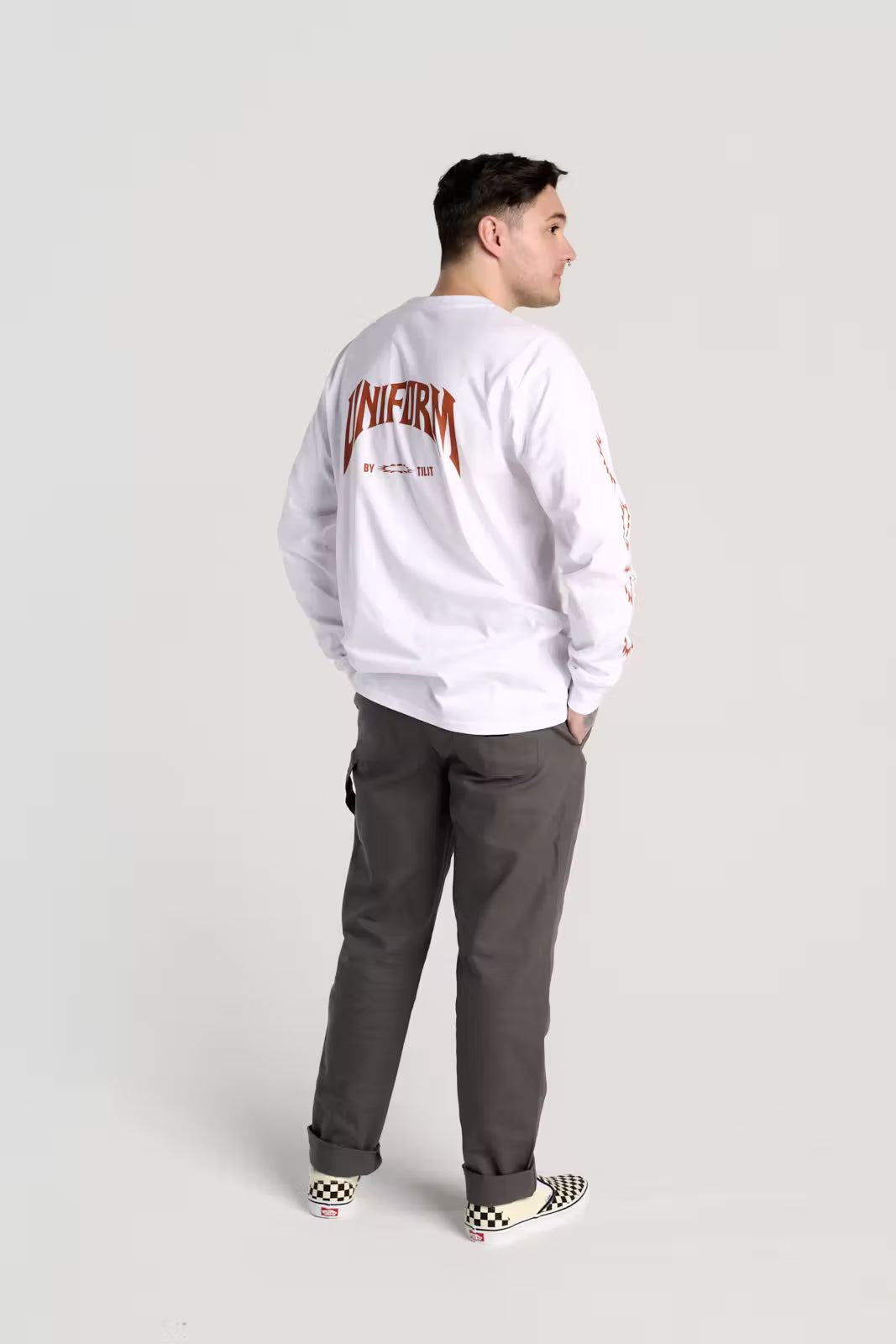 Your essential workwear, redefined. The Uniform Long Sleeve T-Shirt is a versatile staple designed for both the kitchen and the street. Made with custom screen-printed designs on the front, back, and sleeves, this white t-shirt makes a bold statement. It's built to be a reliable piece for everyday wear, offering comfort and style no matter where your day takes you.